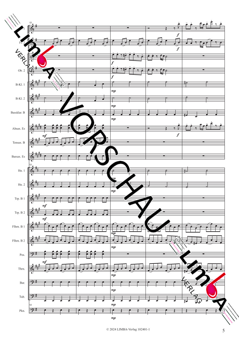 Besetzung: 2 Flöten, 2 Oboen, 2 B-Klarinetten, Bassklarinette, 2 Altsaxophone, Tenorsaxophon, Baritonsaxophon, 2 F-Hörner, 2 B-Trompeten, 2 B-Flügelhörner, 2 Posaunen, Tenorhorn, Bariton, Tuba, Pauke (e);